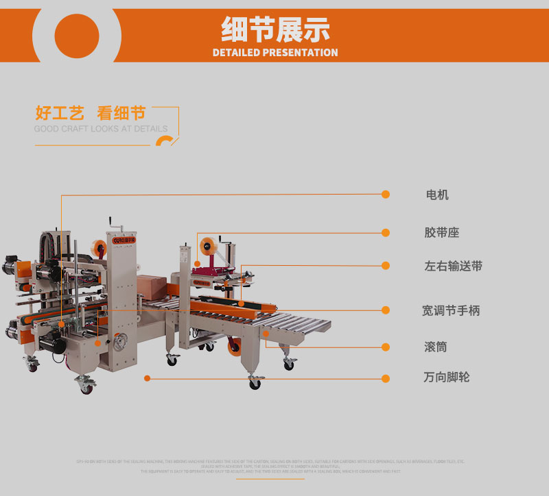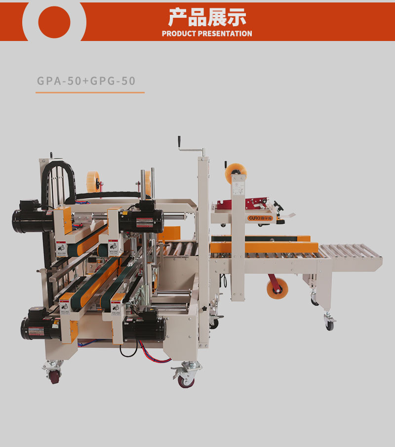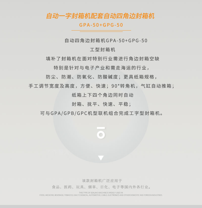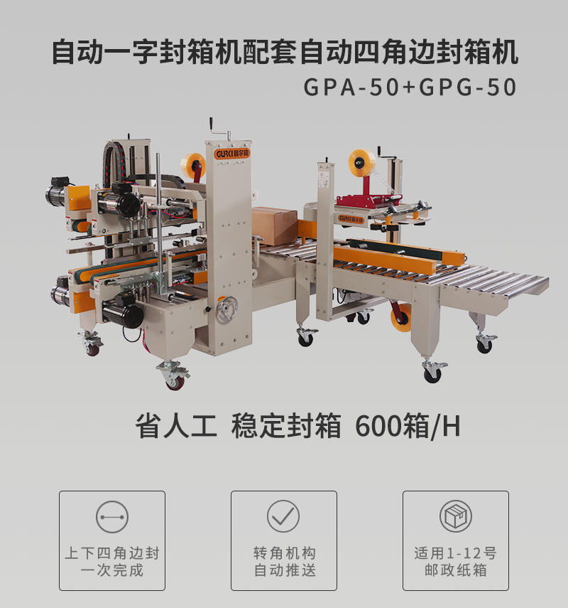 自動(dòng)四角邊封箱機(jī)GPA-50E+GPG-755E工型封箱機(jī)的成功研發(fā),填補(bǔ)了封箱機(jī)在面對(duì)特別行業(yè)需進(jìn)行角邊封箱空缺特別是針對(duì)與電子產(chǎn)業(yè)和需走海運(yùn)的行業(yè),90°轉(zhuǎn)角機(jī),氣缸自動(dòng)推箱;紙箱上下四個(gè)角邊同時(shí)自動(dòng)封箱,可與GPA/GPB/GPC機(jī)型聯(lián)機(jī)組合完成工字型封箱機(jī)。該款封箱機(jī)廣泛應(yīng)用于食品、日化、電子等行業(yè)。