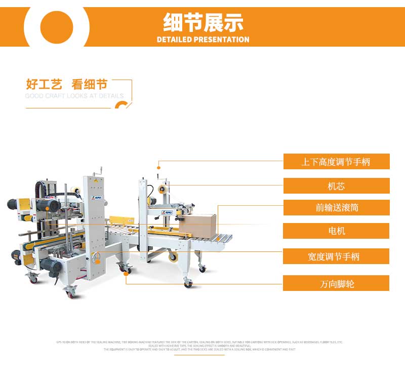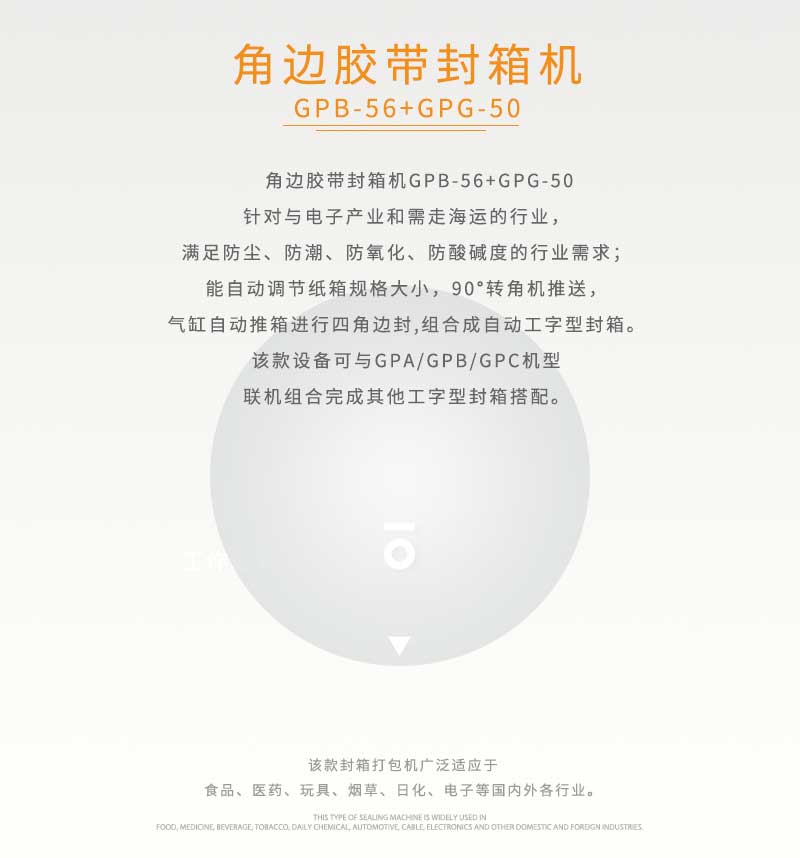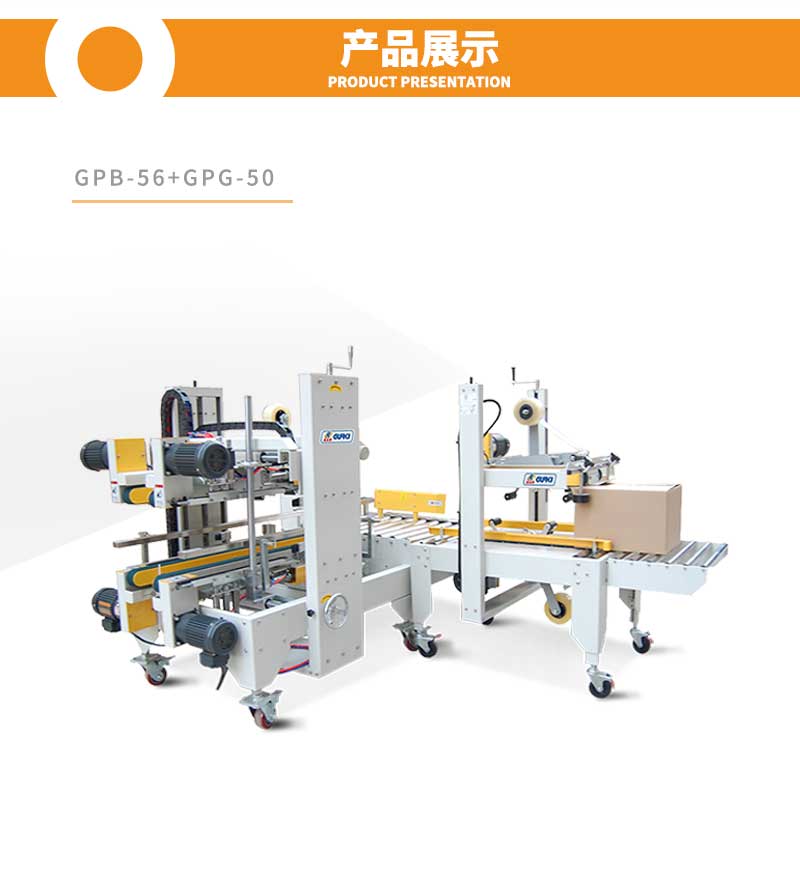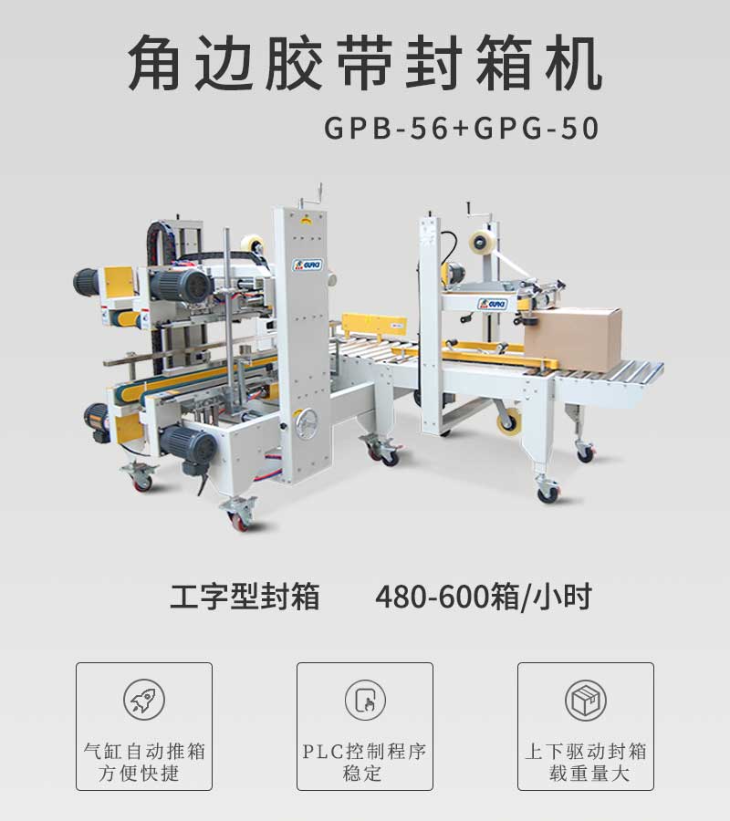 角邊膠帶封箱機(jī)GPB-56+GPG-755E的,適用多種紙箱規(guī)格,僅需手工調(diào)節(jié)寬度及高度,方便、快速;90°轉(zhuǎn)角機(jī),氣缸自動(dòng)推箱;紙箱上下四個(gè)角邊同時(shí)自動(dòng)封箱、撫平、快速、平穩(wěn);可與GPA/GPB/GPC機(jī)型聯(lián)機(jī)組合完成工字型封箱機(jī)。