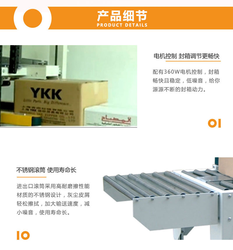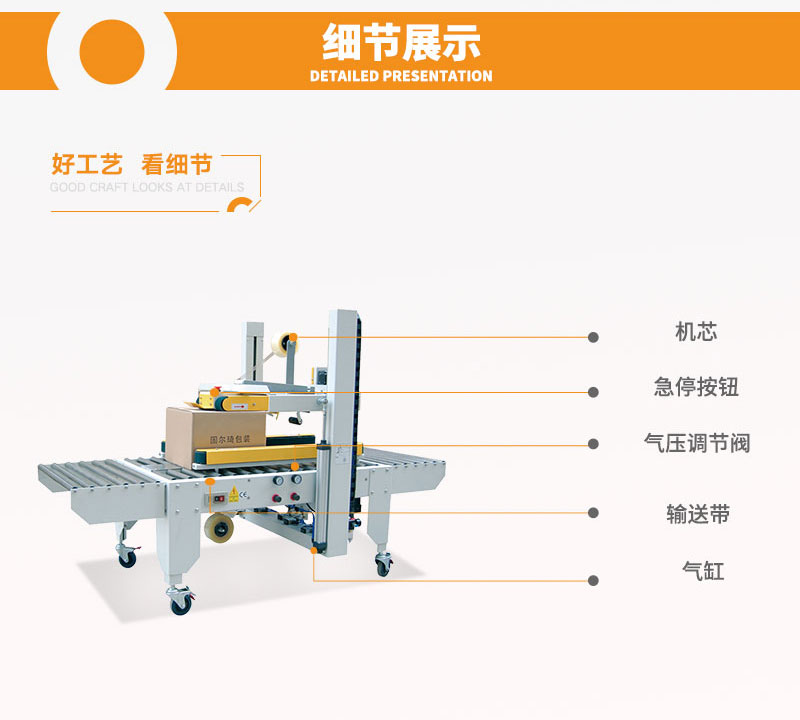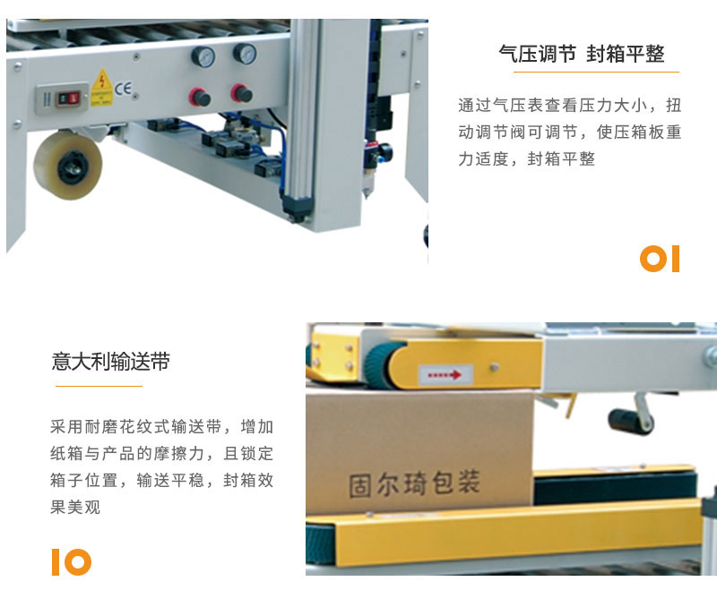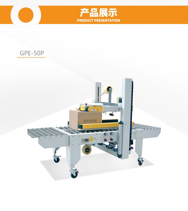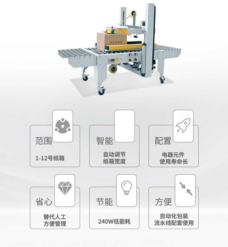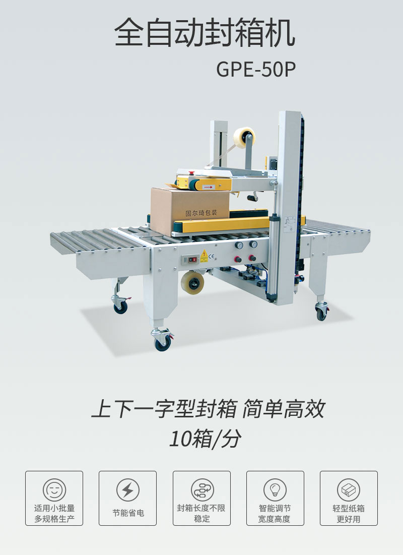 全自動(dòng)封箱機(jī)可根據(jù)不同紙箱規(guī)格,自動(dòng)調(diào)節(jié)寬度及高度,操作方便、簡(jiǎn) 單、快速。上下一字型全自動(dòng)封箱,自動(dòng)化程度高;單機(jī)作業(yè),適合小批量、多規(guī)格生產(chǎn)使用。采用即貼膠帶封口,封箱效果平整、規(guī)范、美觀; 也可以采用印字膠帶,更可提高產(chǎn)品形象。