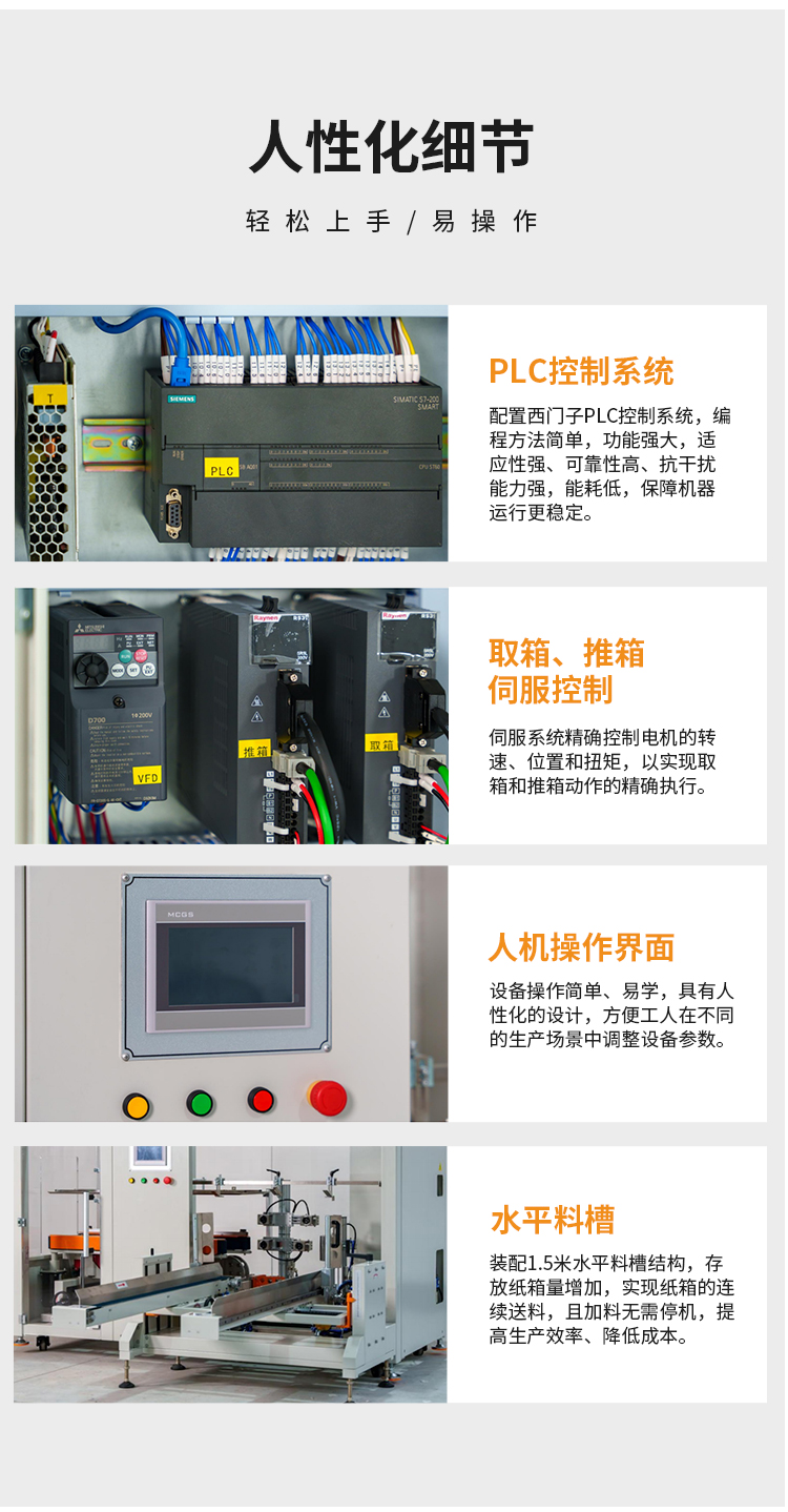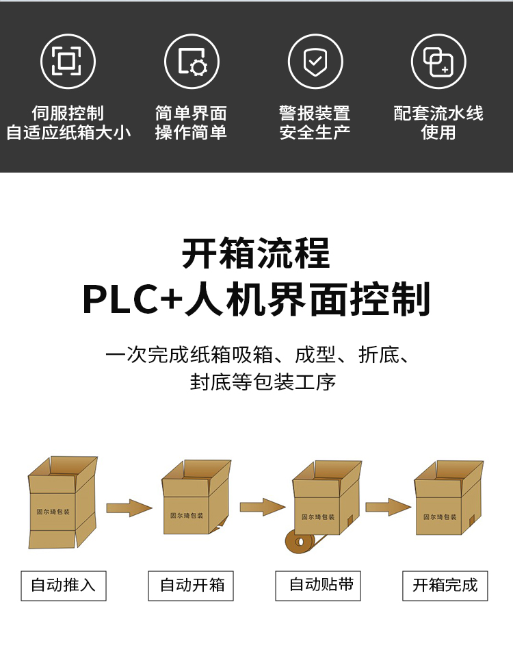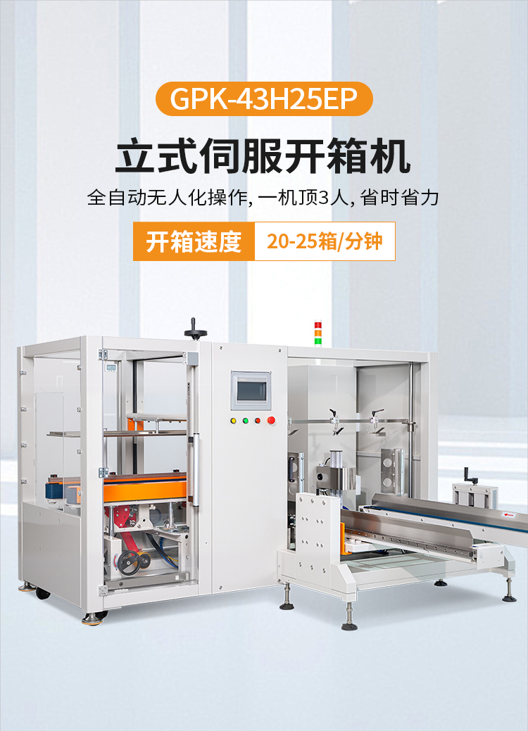 伺服開箱機是通過吸盤將紙箱板從料槽中吸取,實現(xiàn)紙箱板自動拉開成型、底部按一定程序折合成型,并用膠帶密封后輸送給裝箱機的專用設(shè)備,機器采用PLC+人機界面控制,折底不停留,輸送中自動完成折底、封底;同時完成吸箱、成型、折底、封底整 個過程,伺服可實現(xiàn)取箱與推箱部分一鍵切換調(diào)節(jié)。
