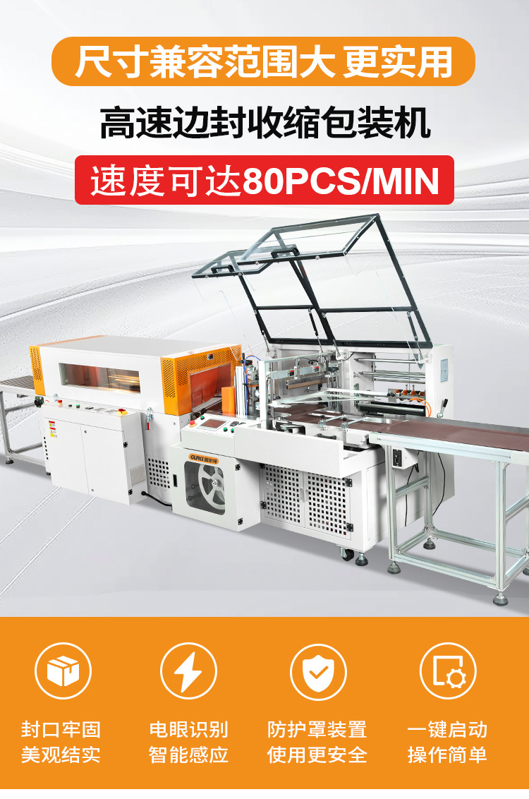 全自動高速邊封收縮包裝機是用于對產(chǎn)品進行全自動在線高速收縮包裝,采用光電對產(chǎn)品進行自動偵測,包裝能力為每分鐘85包,適合包裝 各類型不同大小及形狀的產(chǎn)品。觸屏控制機器,調(diào)節(jié)方便簡單,同時可儲存多種產(chǎn)品包裝數(shù)據(jù),使用時可直接從系統(tǒng)中調(diào)出,方便快捷,大大縮短更換包裝產(chǎn)品時所需的時間。該款收縮包裝機廣泛用于批量生產(chǎn)包裝的流水作業(yè),印刷、彩盒、賀卡、相冊、相框、醫(yī)藥、電子、日 化、化妝品、汽配、五金、食品等大批量生產(chǎn)的行業(yè)。