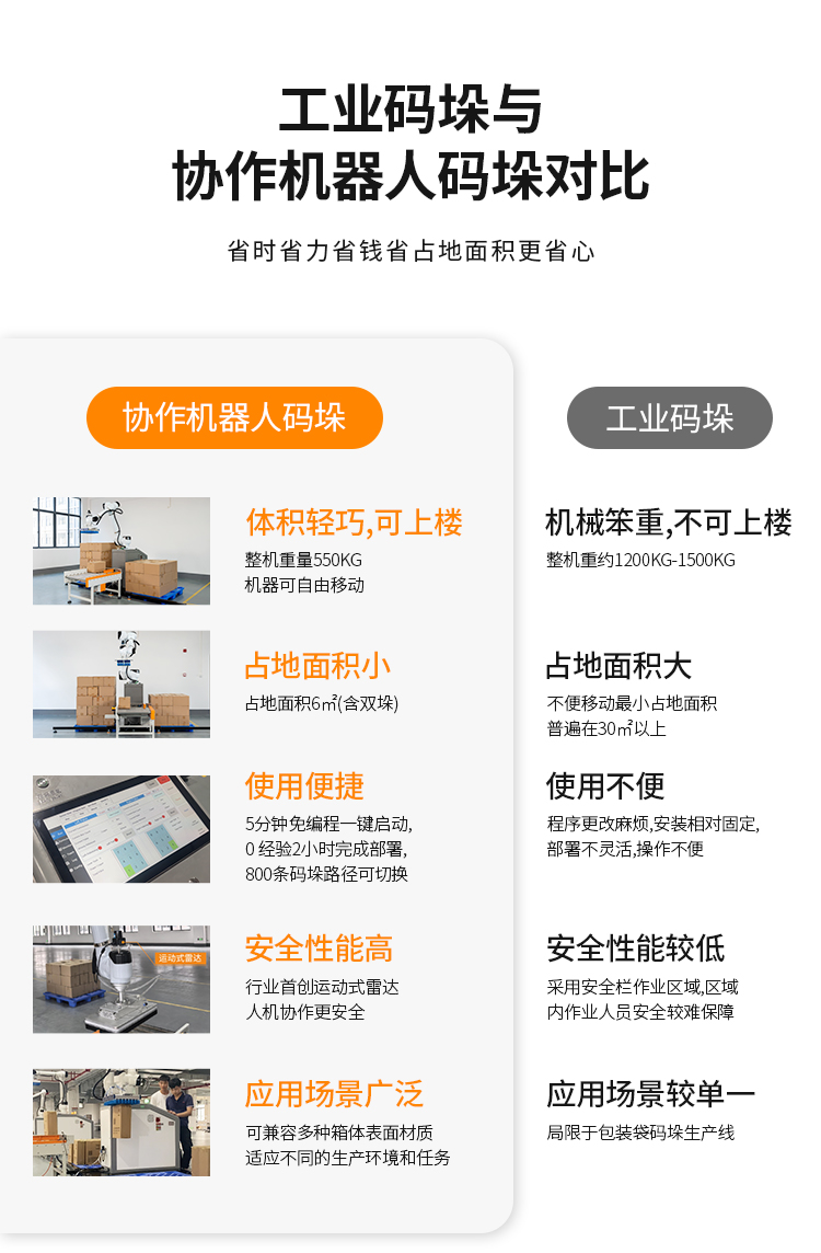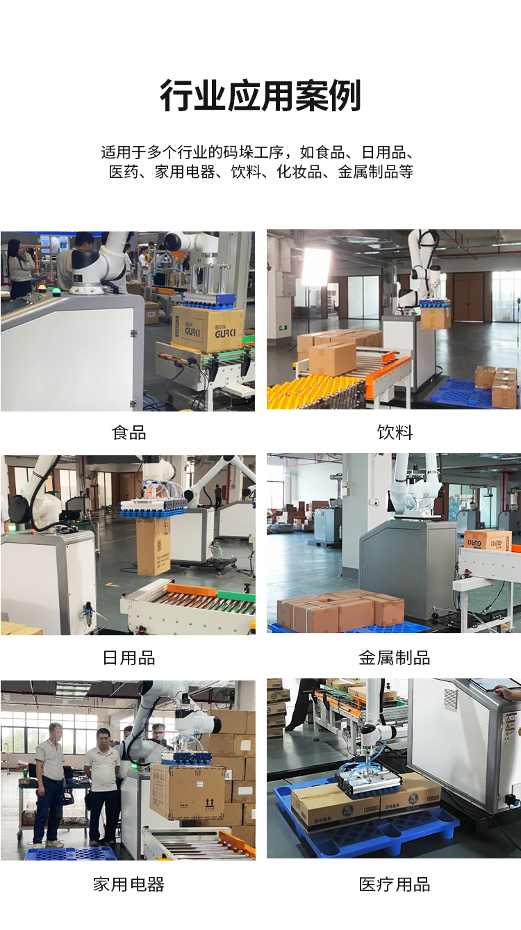 提供3年質(zhì)?;蛘咦鳂I(yè)1000萬次的售后服務(wù)。協(xié)作機(jī)器人碼垛,與人類工作人員緊密合作,提高生產(chǎn)效率、靈活適應(yīng)不同任務(wù)。安全配備傳感器,為工作人員創(chuàng)造更安全高效的工作環(huán)境,外形精巧美觀,調(diào)整方便簡(jiǎn)單,本設(shè)備采用觸控屏操作,實(shí)現(xiàn)智能化操作管理,簡(jiǎn)便、易掌握。可大大地減少勞動(dòng)人員和降低勞動(dòng)強(qiáng)度。可獨(dú)立使用也可配套自動(dòng)供棧機(jī)和棧板輸送機(jī)來實(shí)現(xiàn)全自動(dòng)碼垛系統(tǒng),廣泛應(yīng)用于多個(gè)行業(yè)的碼垛工序,如紙箱類、醫(yī)藥類、日用品、食品、飲料、化妝品、金屬制品等。
