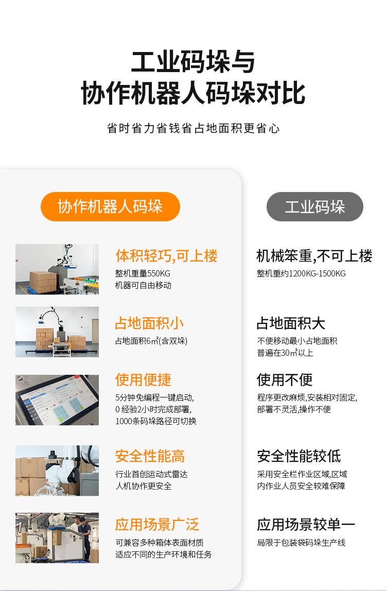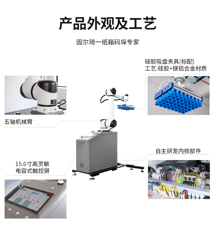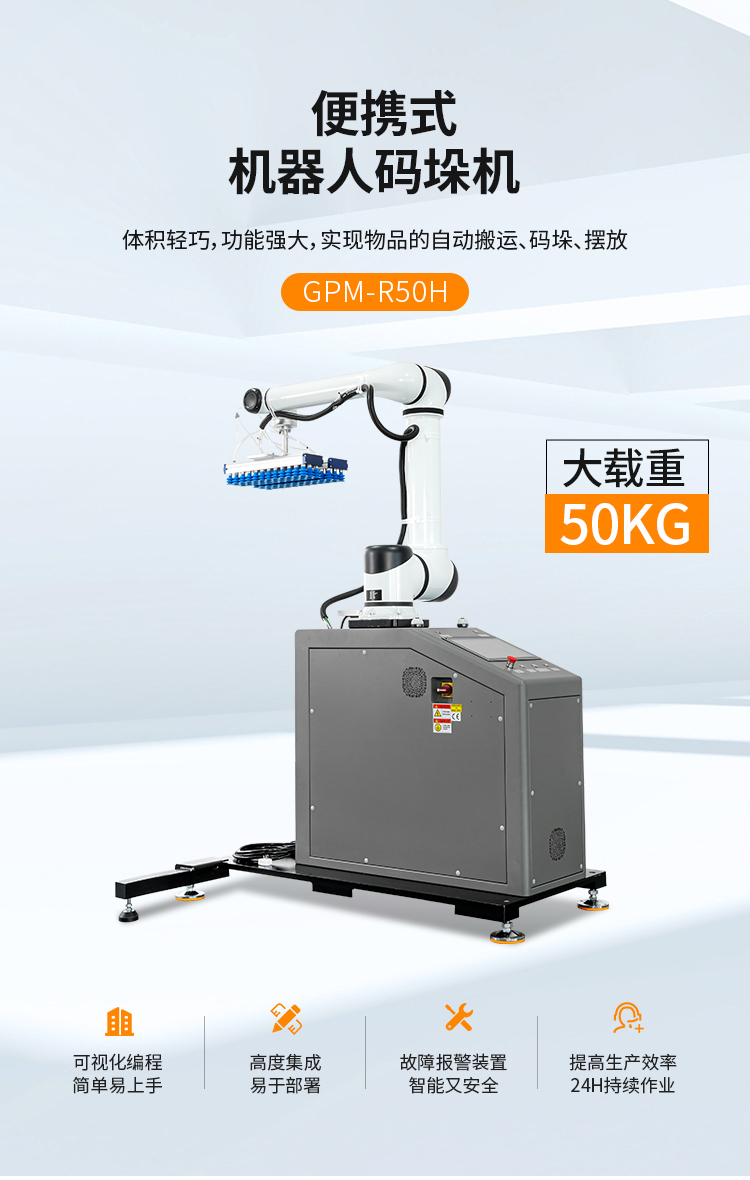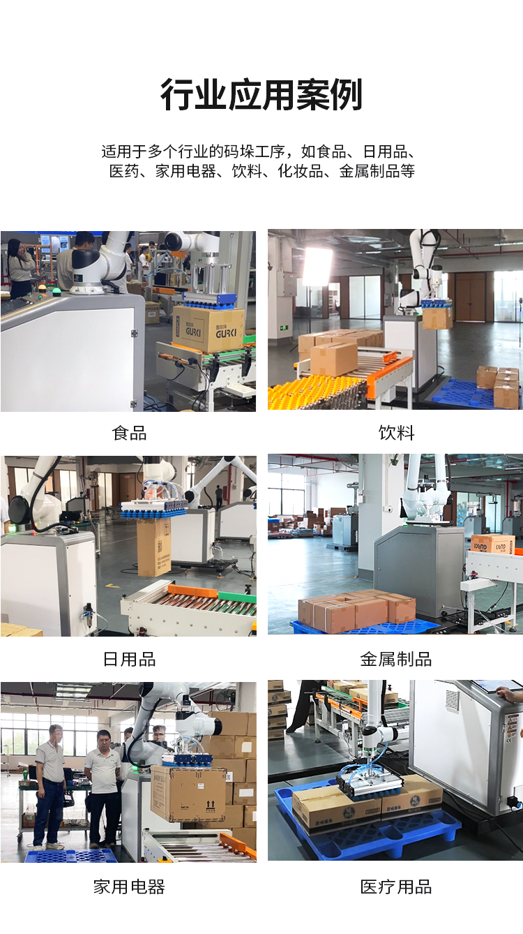 50KG協(xié)作機(jī)器人碼垛,與人類工作人員緊密合作,提高生產(chǎn)效率、靈活適應(yīng)不同任務(wù)。安全配備傳感器,為工作人員創(chuàng)造更安全高效的工作環(huán)境,外形精巧美觀,調(diào)整方便簡單,本設(shè)備采用觸控屏操作,實(shí)現(xiàn)智能化操作管理,簡便、易掌握??纱蟠蟮販p少勞動人員和降低勞動強(qiáng)度??瑟?dú)立使用也可配套自動供棧機(jī)和棧板輸送機(jī)來實(shí)現(xiàn)全自動碼垛系統(tǒng),廣泛應(yīng)用于多個行業(yè)的碼垛工序,如紙箱類、醫(yī)藥類、日用品、食品、飲料、化妝品、金屬制品等。