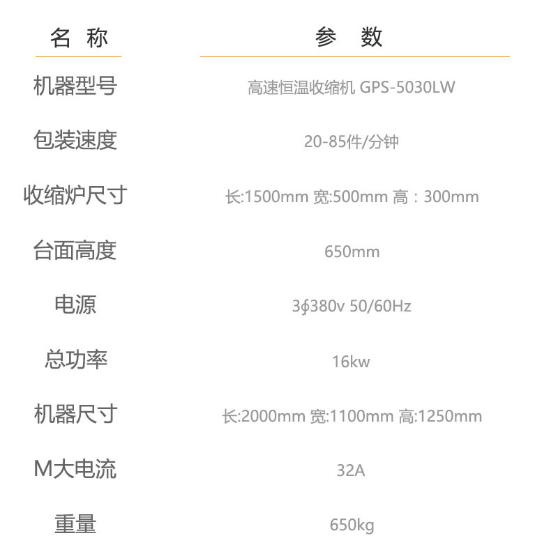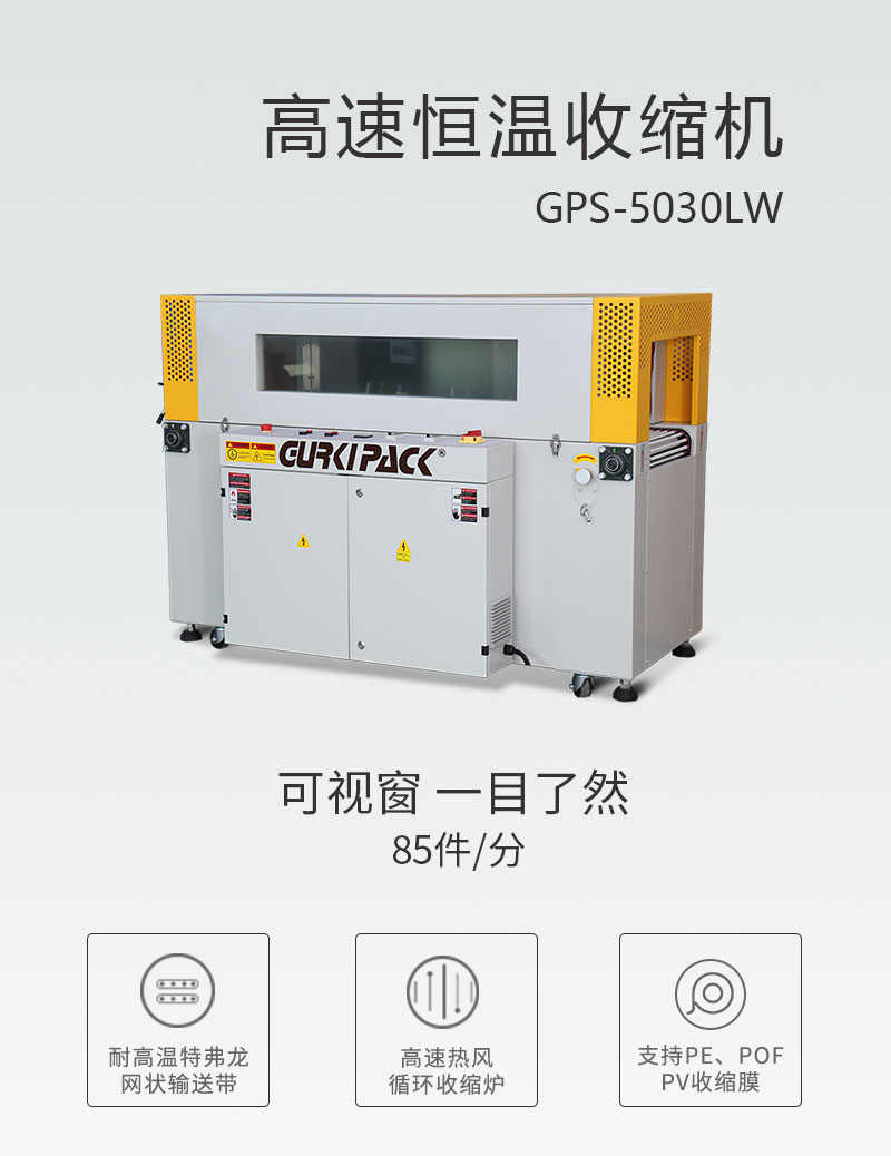 高速恒溫收縮機GPS-5030LW該機性價比高,收縮速度能達85件/分,操作簡單??蓡螜C作業(yè),也可與自動化包裝流水線配套使用。該款收縮機適用于餐飲、日化、醫(yī)藥、禮品、工藝品、玩具、五金、機械等包裝。