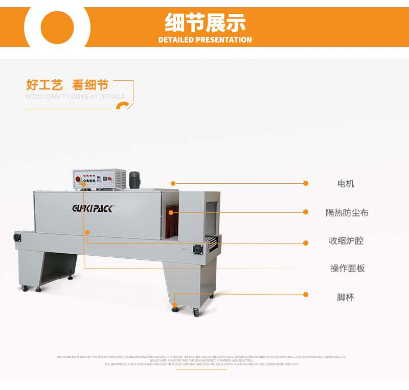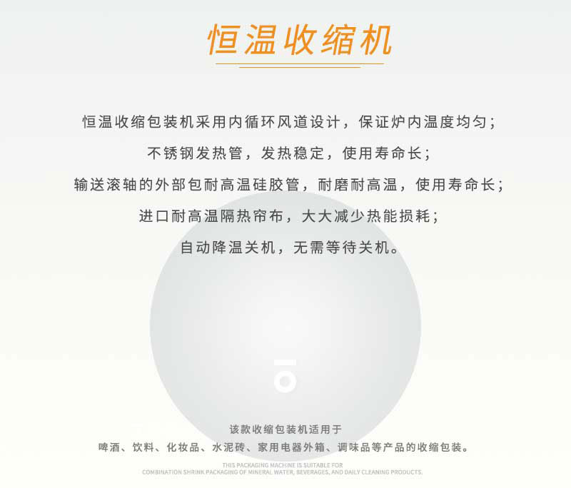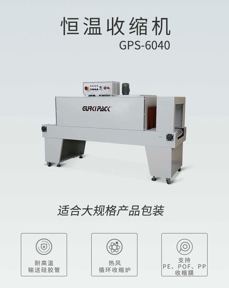恒溫收縮包裝機GPS-6040采用內(nèi)循環(huán)風道設計,保證爐內(nèi)溫度均勻;不銹鋼發(fā)熱管,發(fā)熱穩(wěn)定,使用壽命長;輸送滾軸的外部包配有耐高溫硅膠管,使用壽命長。包裝速度為20-80件/分。該款收縮包裝機適用于食品、醫(yī)藥、飲料、煙草、日化、汽車、線纜、化妝品、電子等行業(yè)。