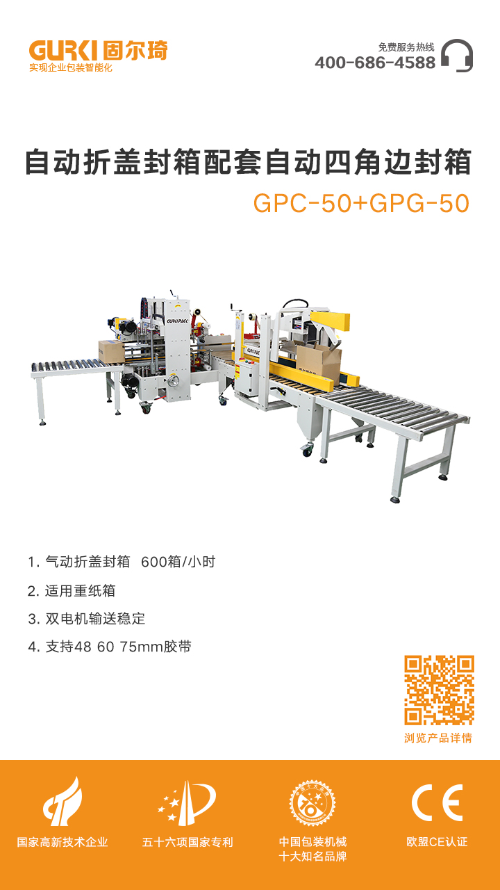 GPC-50+GPG-755E是自動折蓋封箱機與自動四角邊封箱機聯(lián)機配套,形成自動“H”型封箱,能自動折合頂蓋,輸送紙箱,上下“一”字型封箱,兩側(cè)輔助輪協(xié)助機器封箱,保證膠紙不貼歪。緊接著通過L型轉(zhuǎn)角推送,輸送進紙箱進行四角邊封箱作業(yè),簡單實用。該款封箱機廣泛應(yīng)用于食品、醫(yī)藥、飲料、煙草、日化等行業(yè)。